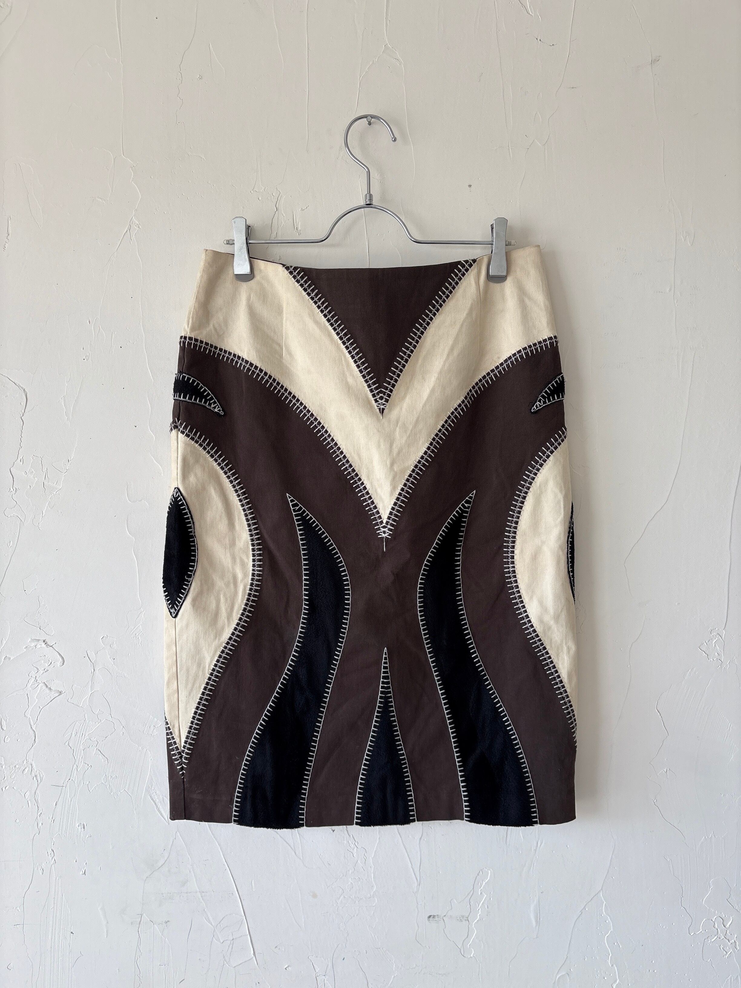 ジグザグ刺繍が特徴のMOSCHINOJEANSタイトスカート。ウエスタンぽい柄が印象的です。イタリア製なので生地がしっかりとしており冬場には大活躍いたします。