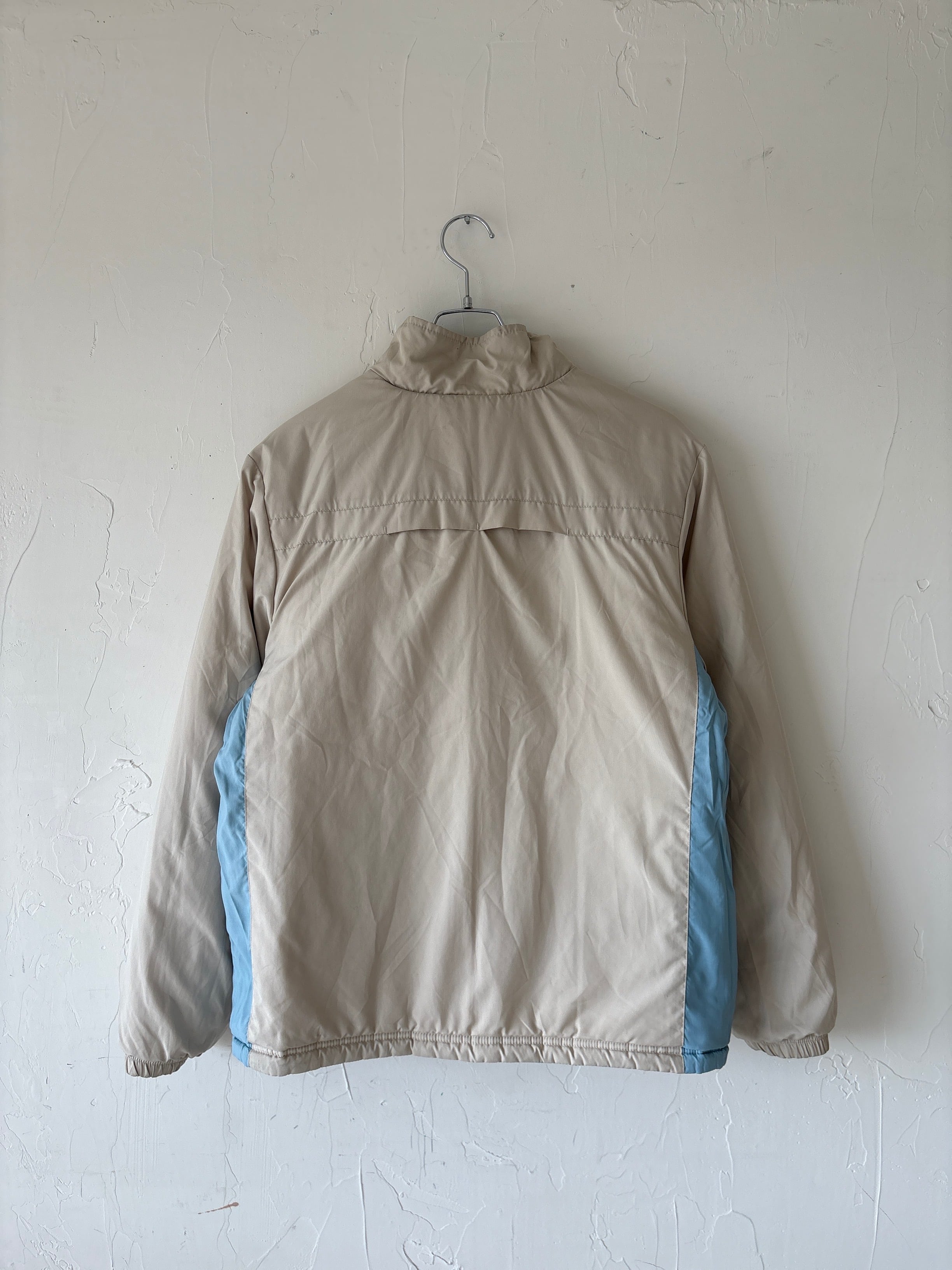 ベージュと水色のリバーシブルフルジップジャケット、フード取り外し可能ででカジュアルなデザイン