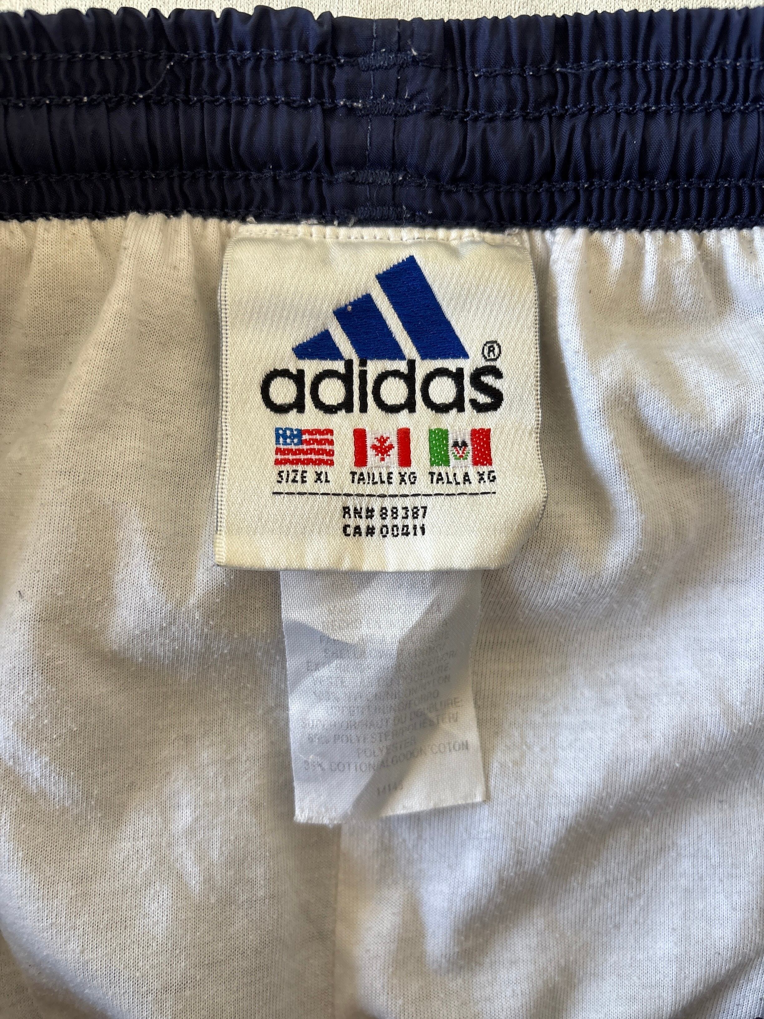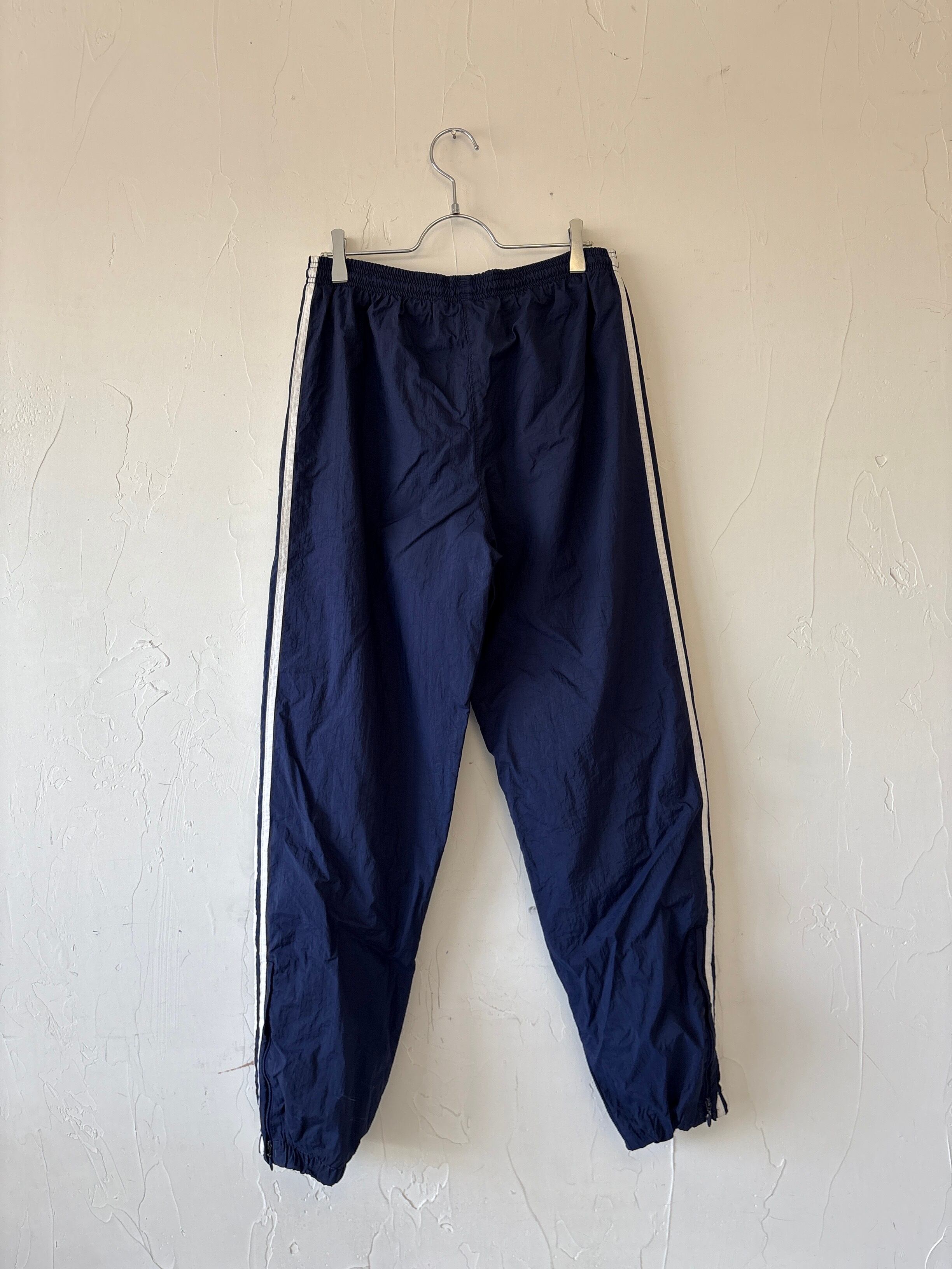 ネイビーのadidasナイロンパンツ、サイドには3本線入っています。