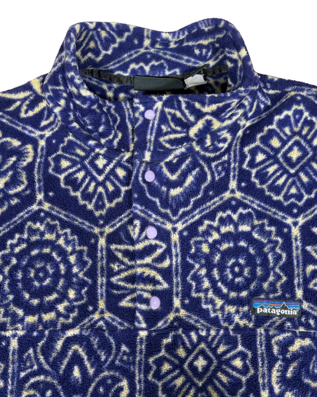 パタゴニアのパープルカラーリングのネパールヘキサゴン柄というスペシャルレアなスナップt。メンズのMサイズでコンディションも袖に一部経年変化によるほつれがある程度で、フリースの潰れなどはございません。お探しの方も多いパタゴニアのアイテムかと思います。存在感抜群で、パタゴニアコレクターは必見です。