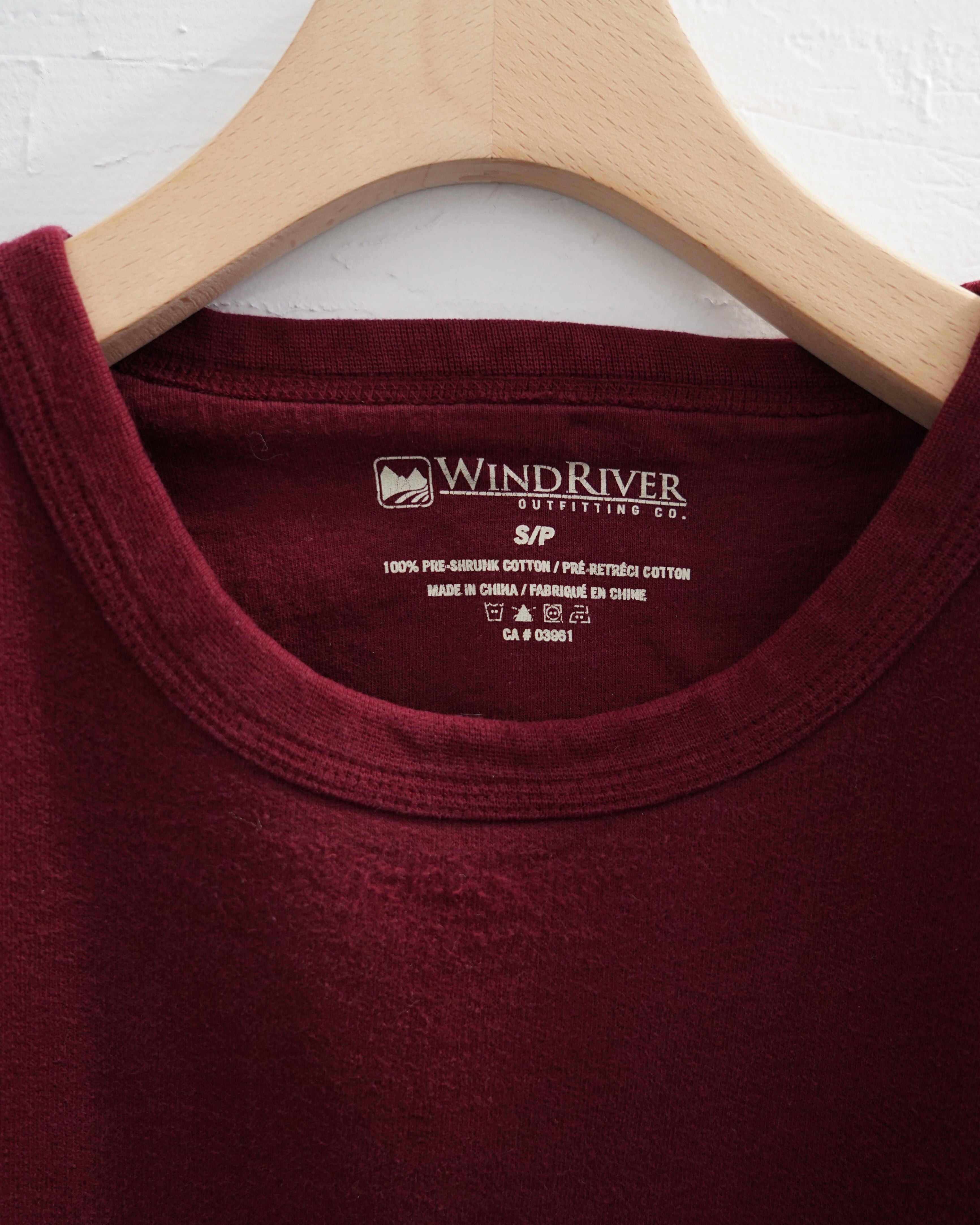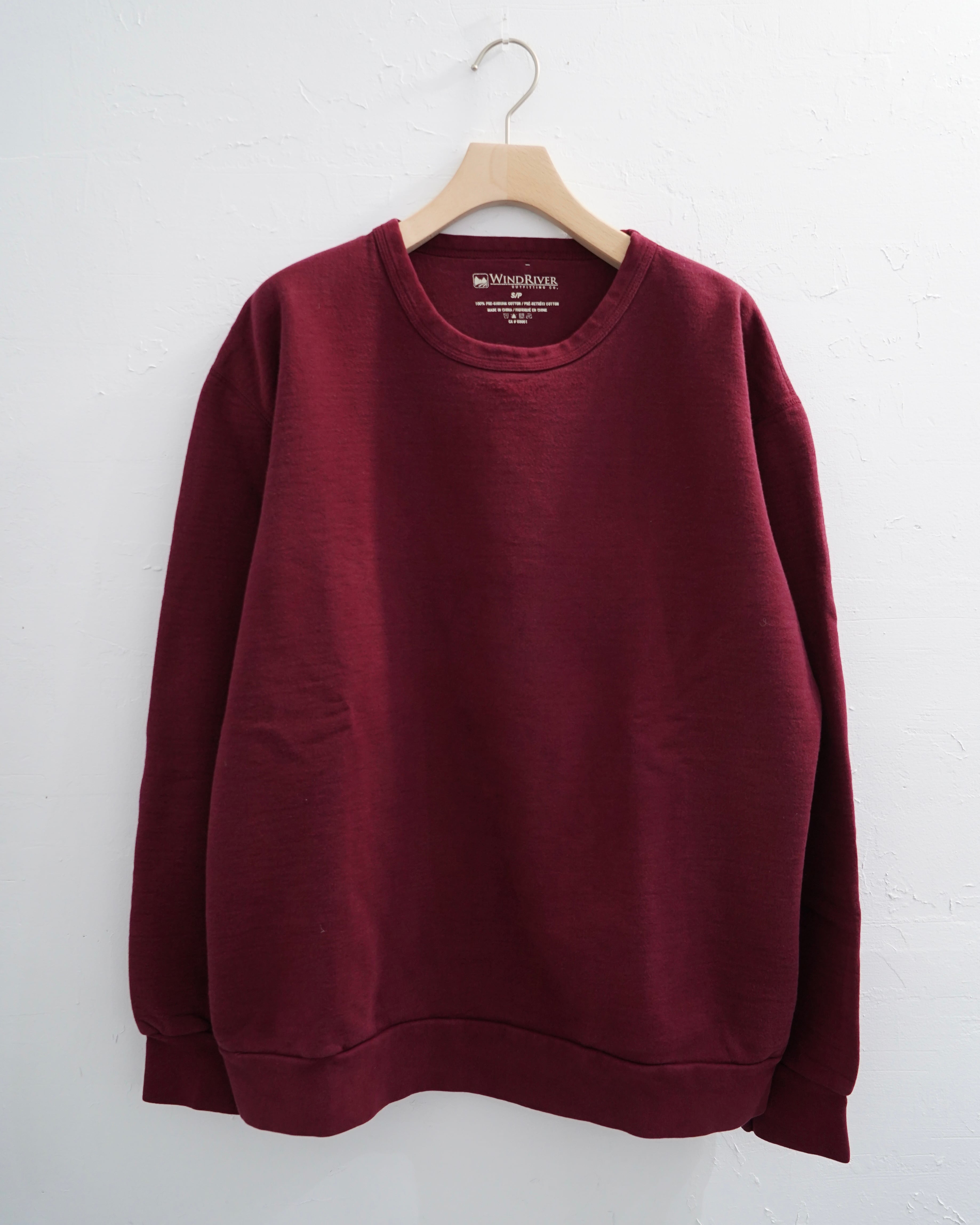 無地仕様のシンプルな一着で、色味は雰囲気抜群のバーガンディです。WINDRIVER特有の経年変化は一般的なスウェットには出せません。生地は乾いた質感で、カナダ製スウェットに多く見られるタフな風合いが特徴。